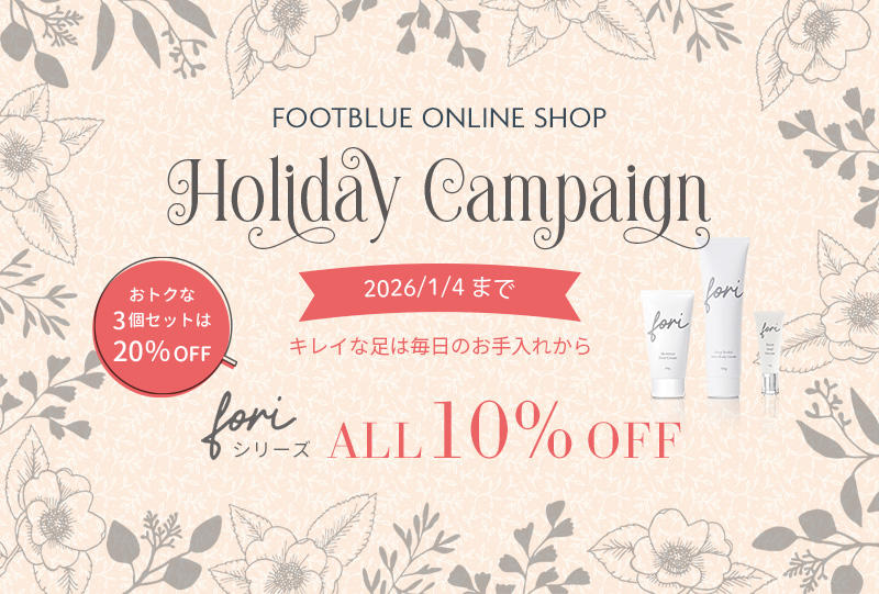フットブルーオンラインショップでは、1月4日まで、サロンオリジナルフットスキンケアシリーズ「fori」が10%OFFでお求めいただけます。