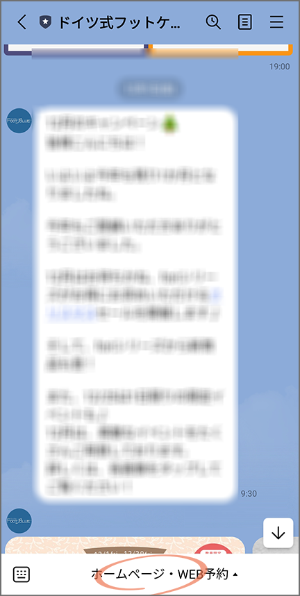 フットブルーのトーク画面下部の「WEB予約」ボタンをクリック。